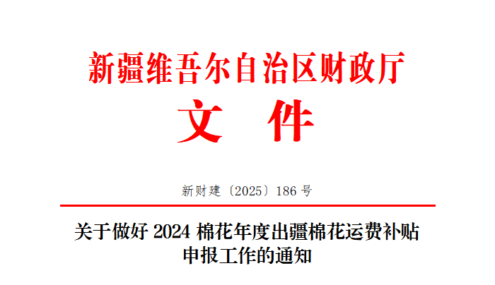 根据自治区财政厅《关于印发〈出疆棉运费补贴操作细则〉的通知》(新财建〔2013〕42号),为便于企业申报2024棉花年度(以下简称2024年度)出疆棉花运费补贴,严格补贴核查工作,提高补贴审核工作效率,现就有关事项通知如下: