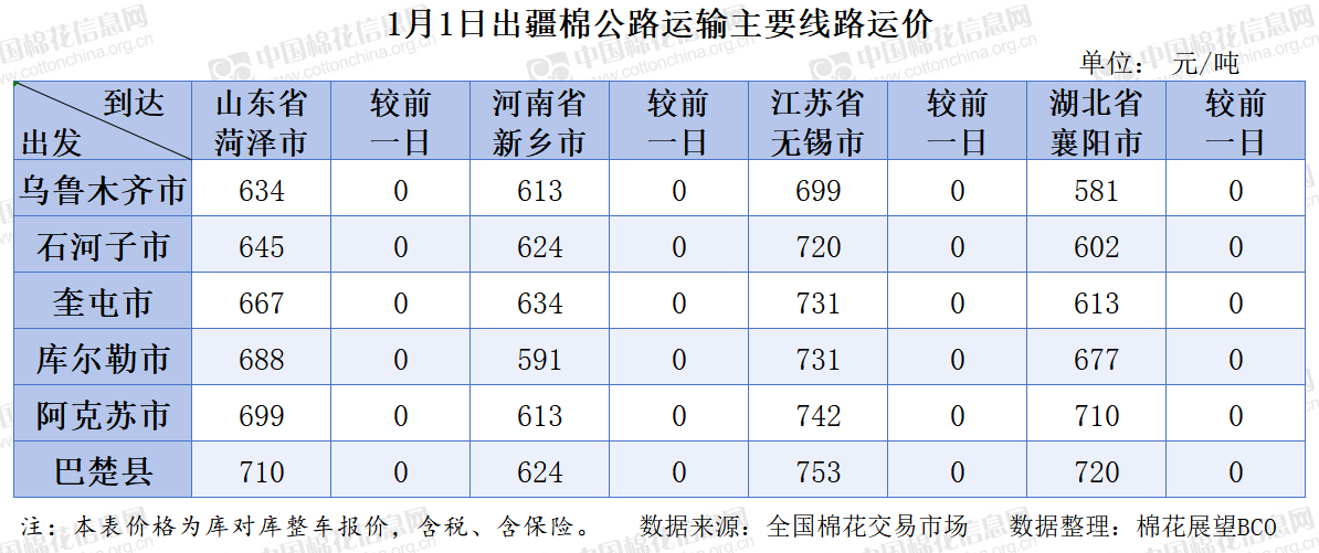 中国棉花信息网专讯 2026年1月1日,出疆棉公路运输价格指数为0.1883元/吨·公里,环比持平。今日,运输需求与运力资源同步增加,指数无变化。预计短期内,运价指数或将呈现整体相对平稳态势。