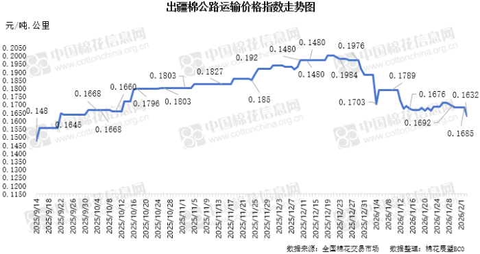 中国棉花信息网专讯 2026年2月3日,出疆棉公路运输价格指数为0.1632元/吨·公里,环比下跌3.15%。今日,运输需求基本持平,运力资源相对充足,指数小幅下降。预计短期内,运价指数或将呈现整体窄幅震荡态势。