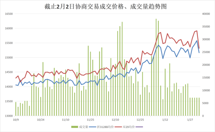 中国棉花信息网专讯 2月2日,全国棉花交易市场协商交易总成交量为25495吨。其中一口价成交22667吨,基差后点价成2828吨。一口价成交量占总成交量的88.91%。一口价资源成交均价为15393元/吨,折3128均价为15163元/吨,较上一交易日的15577元/吨下跌414元/吨。其中双29批次成交均价为15315元/吨,较上一交易日的15913元/吨下跌598元/吨。