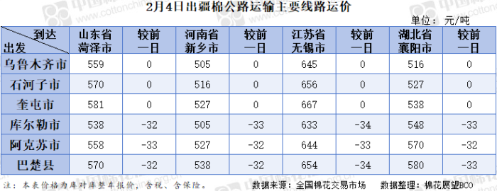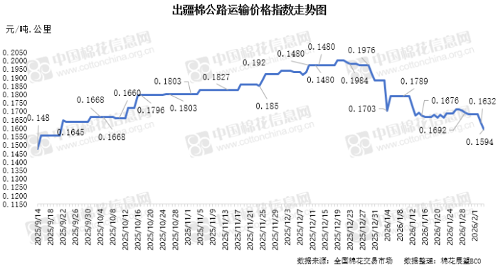 中国棉花信息网专讯 2026年2月4日,出疆棉公路运输价格指数为0.1594元/吨·公里,环比下跌2.33%。今日,运输需求减少,运力资源相对充足,指数小幅下降。预计短期内,运价指数或将呈现整体窄幅震荡态势。