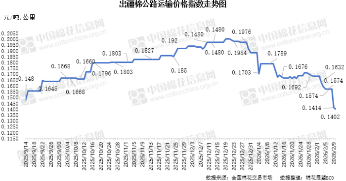 中国棉花信息网专讯 2026年2月10日,出疆棉公路运输价格指数为0.1402元/吨·公里,环比下跌0.85%。今日,运输需求基本平稳,运力资源局部充足,指数小幅下降。预计短期内,运价指数或将延续整体承压下行态势。