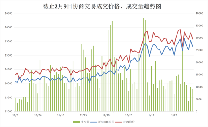 中国棉花信息网专讯 2月9日,全国棉花交易市场协商交易总成交量为9201吨。其中一口价成交7200吨,基差后点价成2001吨。一口价成交量占总成交量的78.25%。一口价资源成交均价为15671元/吨,折3128均价为15304元/吨,较上一交易日的15526元/吨下跌222吨。其中双29批次成交均价为15575元/吨,较上一交易日的15799元/吨下跌224元/吨。