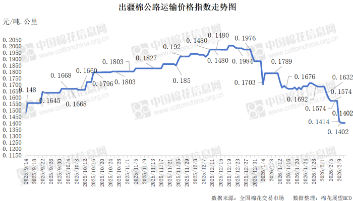 中国棉花信息网专讯 2026年2月12日,出疆棉公路运输价格指数为0.1402元/吨·公里,环比持平。今日,运输需求和运力资源同步减少,指数无变化。预计短期内,运价指数或将呈现整体相对平稳态势。