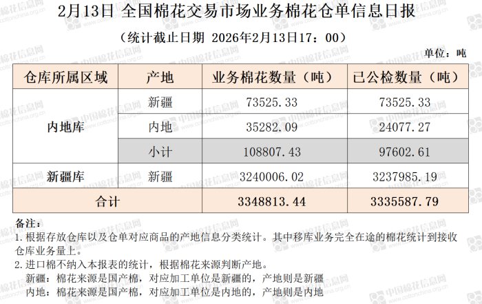 【仓单日报】CNCE业务棉花信息(2.13)