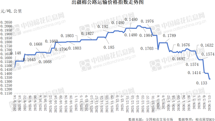中国棉花信息网专讯 2026年2月14日,出疆棉公路运输价格指数为0.1330元/吨·公里,环比持平。今日,运输需求和运力资源同步减少、处于低位,指数无变化。预计短期内,运价指数或将呈现整体相对平稳态势。