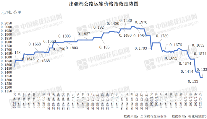 中国棉花信息网专讯 2026年2月15日,出疆棉公路运输价格指数为0.1330元/吨·公里,环比持平。今日,运输需求和运力资源同步减少、处于低位,指数无变化。预计短期内,运价指数或将呈现整体相对平稳态势。