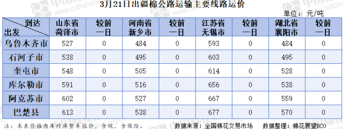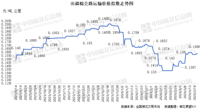 中国棉花信息网专讯 2026年3月21日,出疆棉公路运输价格指数为0.1576元/吨·公里,环比持平。今日,运输需求和运力资源同步增加,指数无变化。预计短期内,运价指数将呈现整体相对平稳态势。