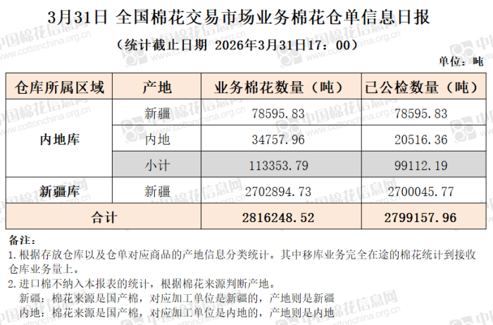 【仓单日报】CNCE业务棉花信息(3.31)
