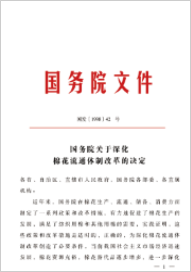 《国务院关于深化棉花流通体制改革的决定》(国发〔1998〕42号)提出:“要加快建立以全国棉花交易市场为中心、以棉花集中产销区为依托、实行计算机网络化管理的全国棉花交易网络,充分发挥其价格形成和信息传递功能。要完善交易规则,严格市场准入制度。国家利用全国棉花交易市场采购和投放国家储备棉,对棉花供求和价格进行调控。各有关部门要切实支持全国棉花交易市场正常运行”。 国务院42号文件批准设立全国棉花交易市场。