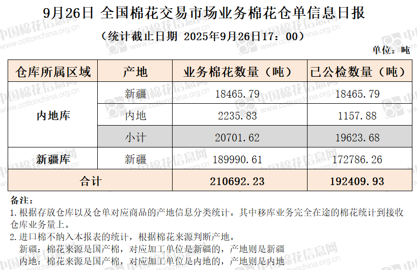 【仓单日报】CNCE业务棉花信息(9.26)
