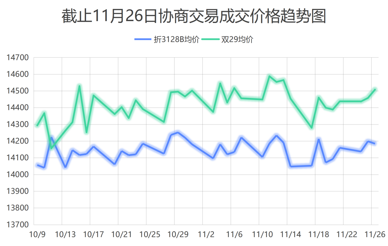 中国棉花信息网专讯 11月26日,全国棉花交易市场协商交易总成交量为21967吨。其中一口价成交16441吨,基差后点价成交5526吨。一口价成交量占总成交量的69.39%。一口价资源成交均价为14549元/吨,折3128均价为14185元/吨,较上一交易日的14199元/吨下跌14元/吨。其中双29批次成交均价为14508元/吨,较上一交易日的14458元/吨上涨50元/吨。