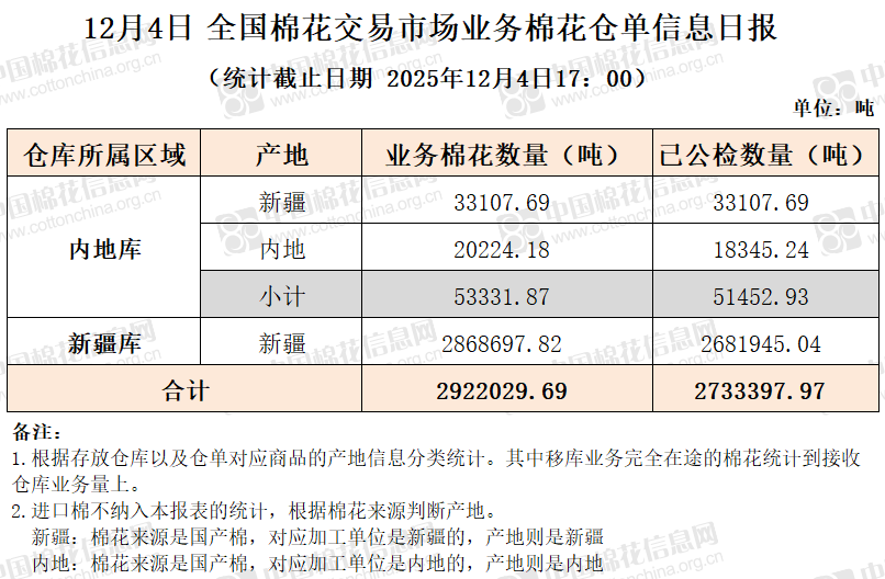 【仓单日报】CNCE业务棉花信息(12.4)