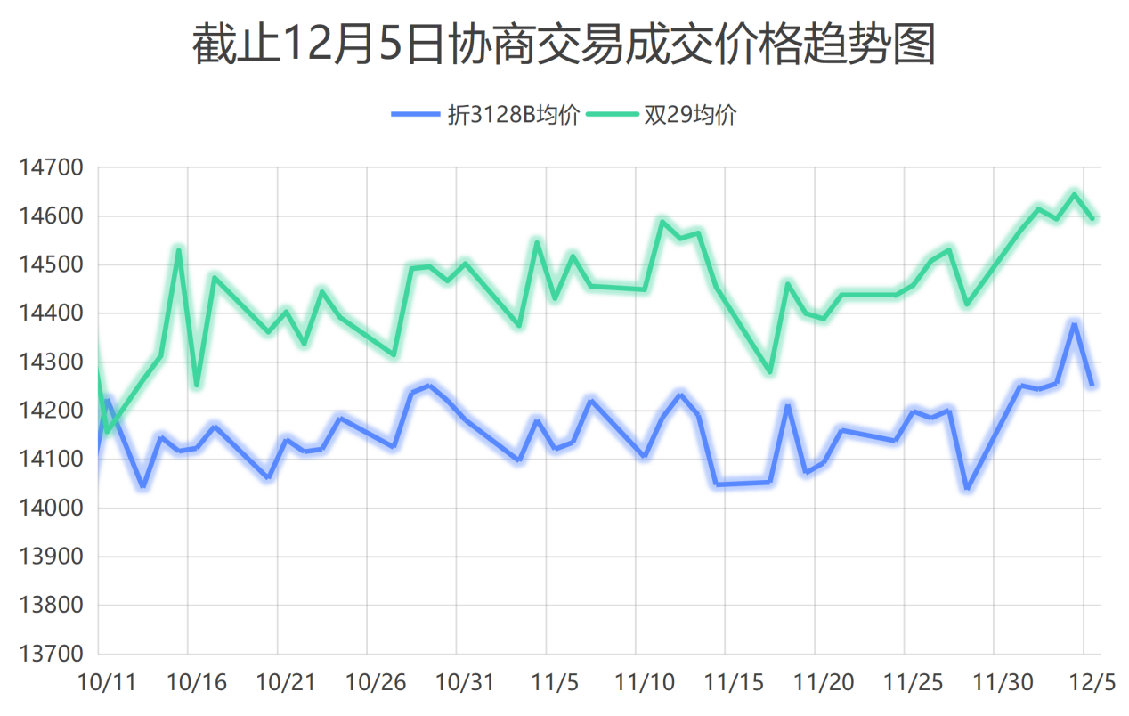 中国棉花信息网专讯12月5日,全国棉花交易市场协商交易总成交量为9548吨。其中一口价成交7579吨,基差后点价成交1969吨。一口价成交量占总成交量的79.38%。一口价资源成交均价为14628元/吨,折3128均价为14251元/吨,较上一交易日的14380元/吨下跌129元/吨。其中双29批次成交均价为14595元/吨,较上一交易日的14644元/吨下跌49元/吨。