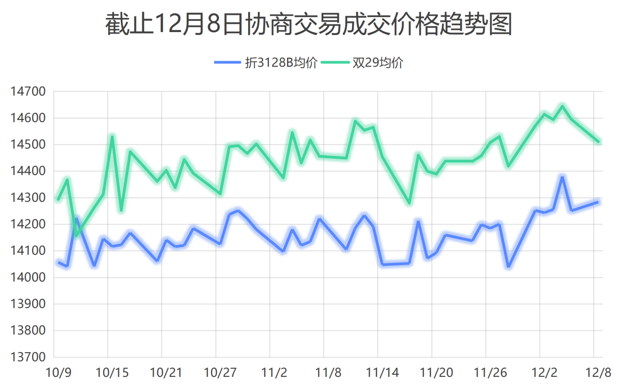 中国棉花信息网专讯 12月8日,全国棉花交易市场协商交易总成交量为22601吨。其中一口价成交11329吨,基差后点价成交11272吨。一口价成交量占总成交量的50.13%。一口价资源成交均价为14626元/吨,折3128均价为14284元/吨,较上一交易日的14251元/吨上涨33元/吨。其中双29批次成交均价为14511元/吨,较上一交易日的14595元/吨下跌84元/吨。