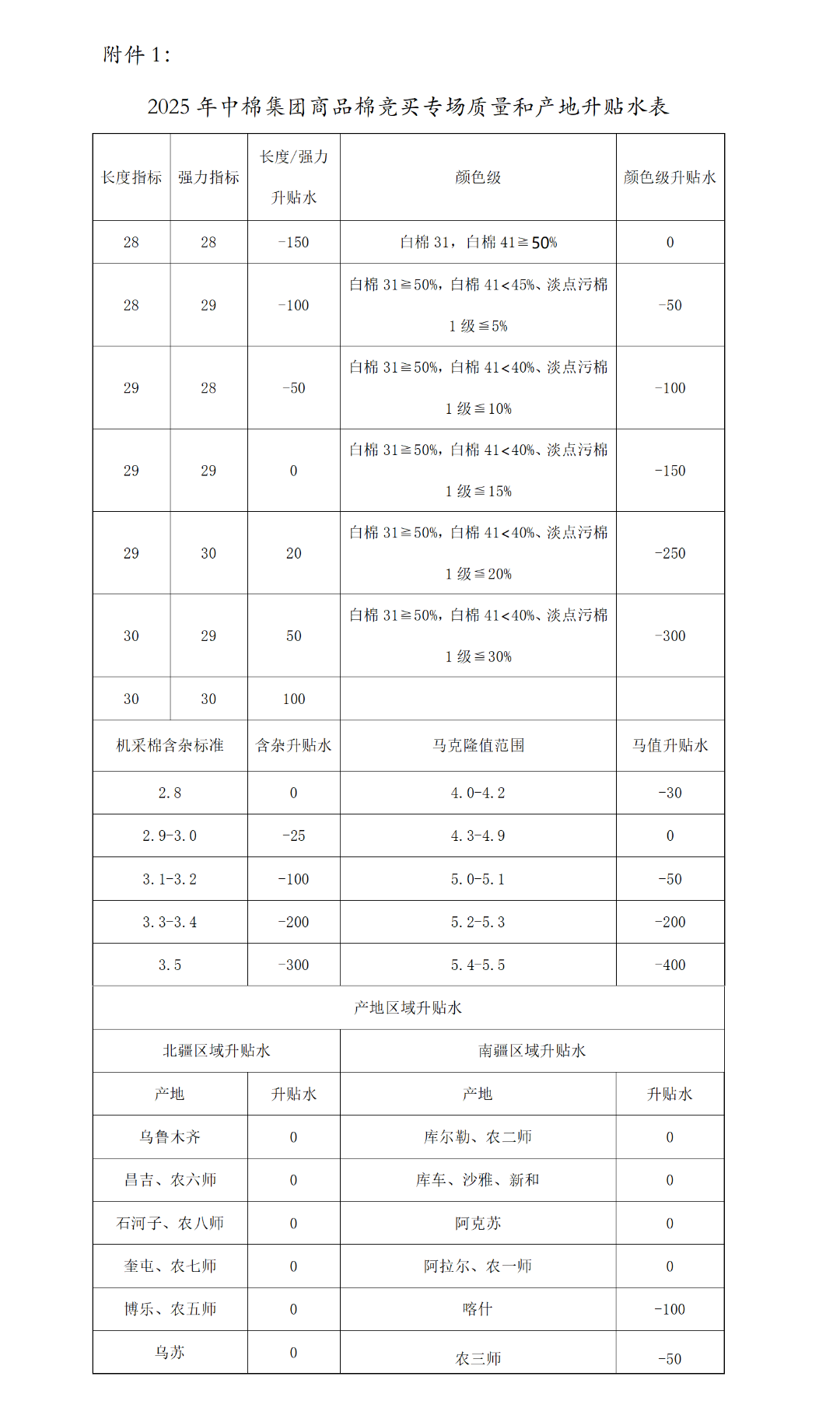 1.2025年中棉集团商品棉竞买专场质量和产地升贴水表
