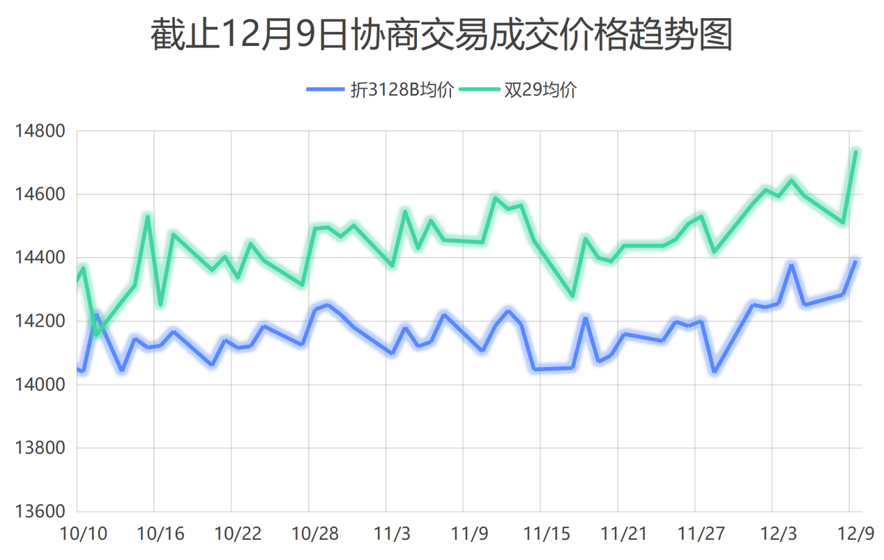 中国棉花信息网专讯 12月9日,全国棉花交易市场协商交易总成交量为16361吨。其中一口价成交12244吨,基差后点价成交4117吨。一口价成交量占总成交量的74.83%。一口价资源成交均价为14708元/吨,折3128均价为14391元/吨,较上一交易日的14284元/吨上涨107元/吨。其中双29批次成交均价为14733元/吨,较上一交易日的14511元/吨上涨222元/吨。