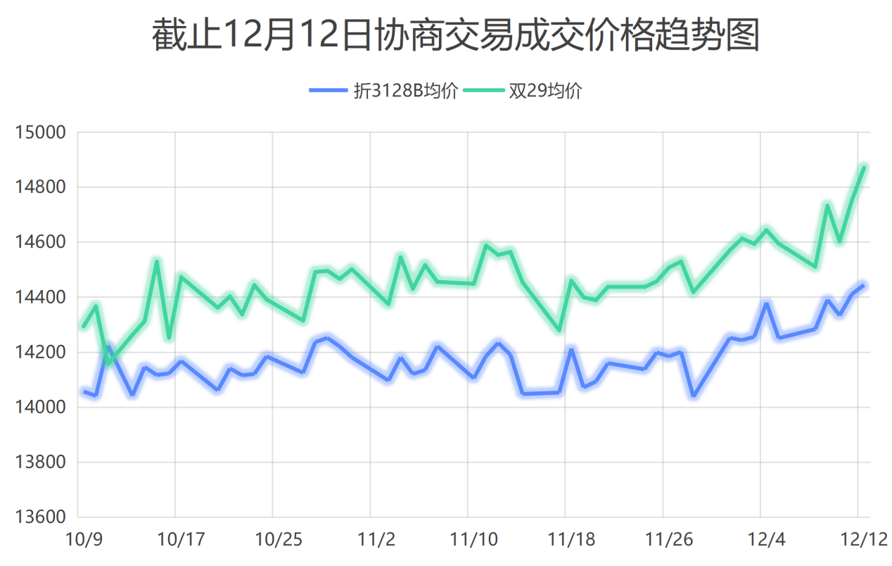 中国棉花信息网专讯 12月12日,全国棉花交易市场协商交易总成交量为35128吨。其中一口价成交27578吨,基差后点价成交7550吨。一口价成交量占总成交量的78.51%。一口价资源成交均价为14775元/吨,折3128均价为14445元/吨,较上一交易日的14411元/吨上涨34元/吨。其中双29批次成交均价为14871元/吨,较上一交易日的14752元/吨上涨119元/吨。