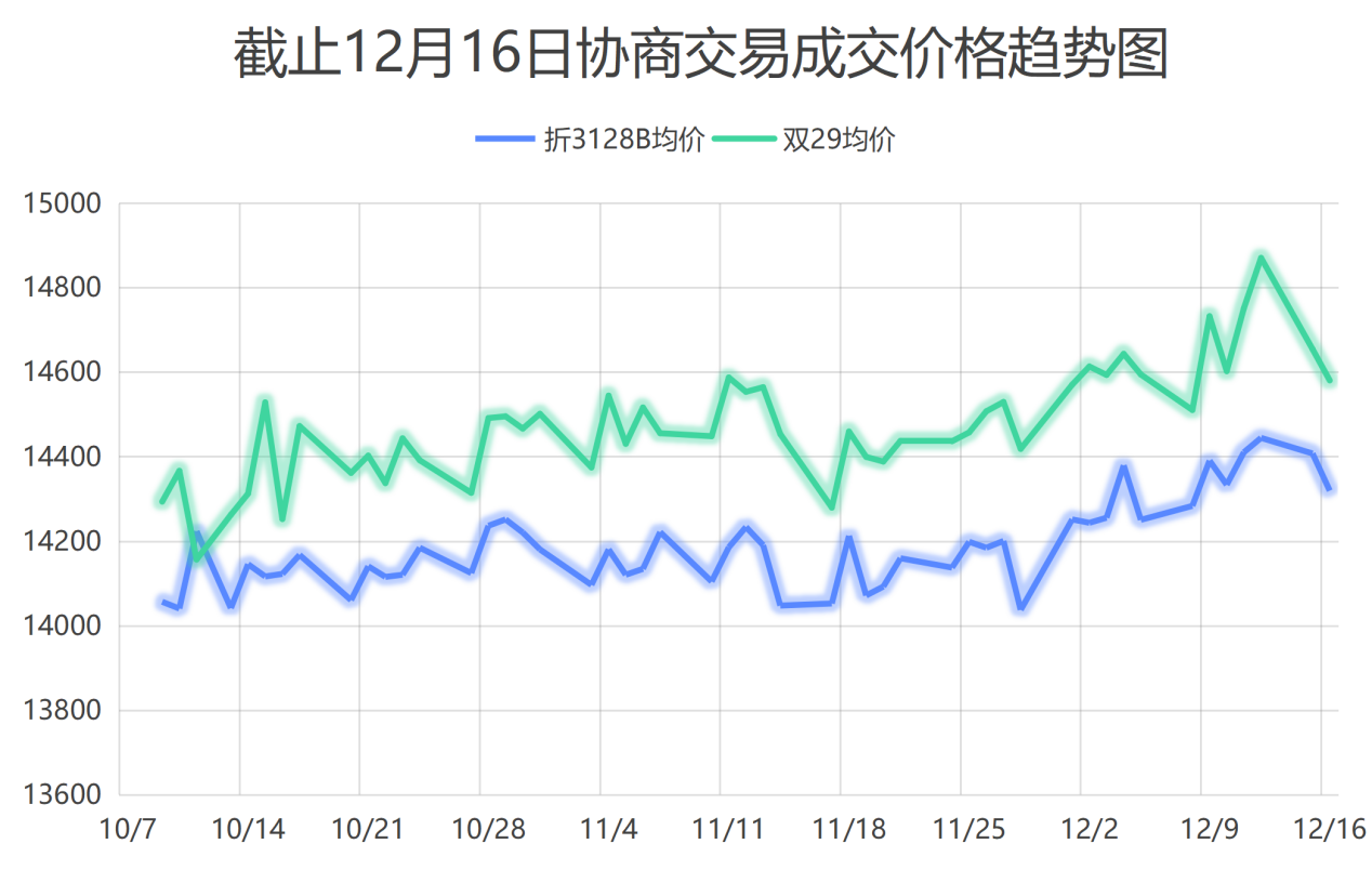 中国棉花信息网专讯 12月16日,全国棉花交易市场协商交易总成交量为22123吨。其中一口价成交17648吨,基差后点价成交4475吨。一口价成交量占总成交量的79.77%。一口价资源成交均价为14665元/吨,折3128均价为14320元/吨,较上一交易日的14408元/吨下跌88元/吨。其中双29批次成交均价为14581元/吨,较上一交易日的14655元/吨下跌74元/吨。