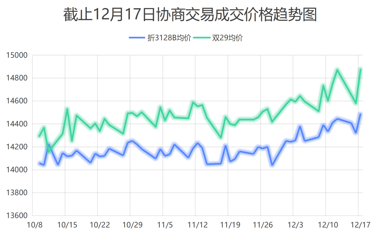 中国棉花信息网专讯 12月17日,全国棉花交易市场协商交易总成交量为20706吨。其中一口价成交13948吨,基差后点价成交6758吨。一口价成交量占总成交量的67.36%。一口价资源成交均价为14848元/吨,折3128均价为14489元/吨,较上一交易日的14320元/吨上涨169元/吨。其中双29批次成交均价为14875元/吨,较上一交易日的14581元/吨上涨294元/吨。