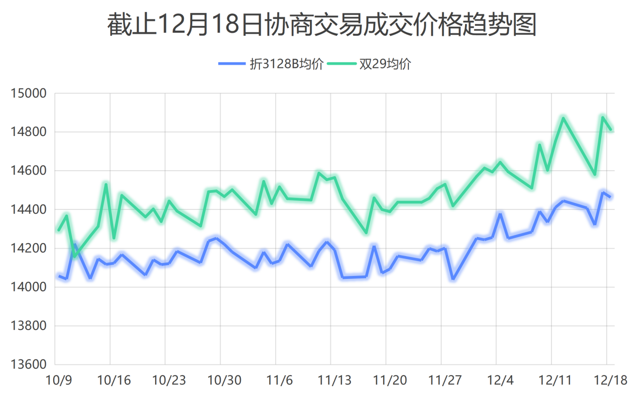 中国棉花信息网专讯 12月18日,全国棉花交易市场协商交易总成交量为15439吨。其中一口价成交12216吨,基差后点价成交3223吨。一口价成交量占总成交量的79.12%。一口价资源成交均价为14823元/吨,折3128均价为14463元/吨,较上一交易日的14489元/吨下跌26元/吨。其中双29批次成交均价为14813元/吨,较上一交易日的14875元/吨下跌62元/吨。