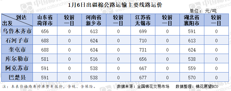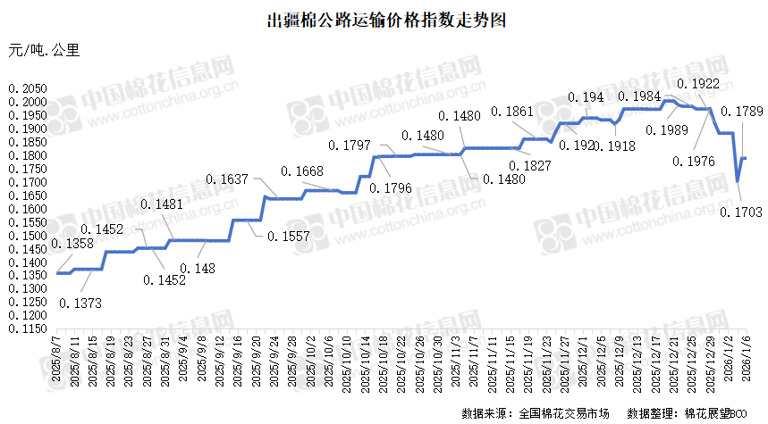 中国棉花信息网专讯 2026年1月6日,出疆棉公路运输价格指数为0.1789元/吨·公里,环比持平。今日,运输需求与运力资源同步增加,指数无变化。预计短期内,运价指数或将呈现整体相对平稳态势。