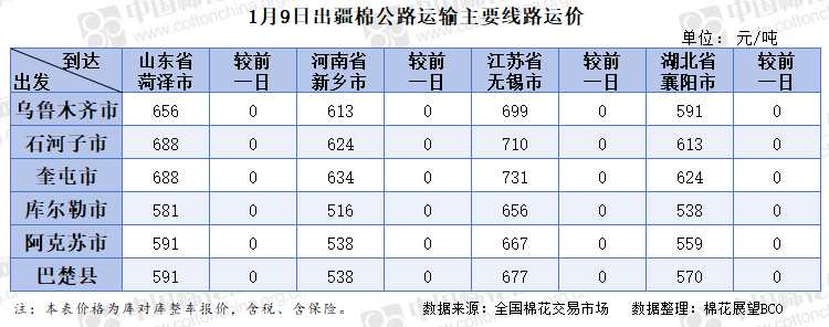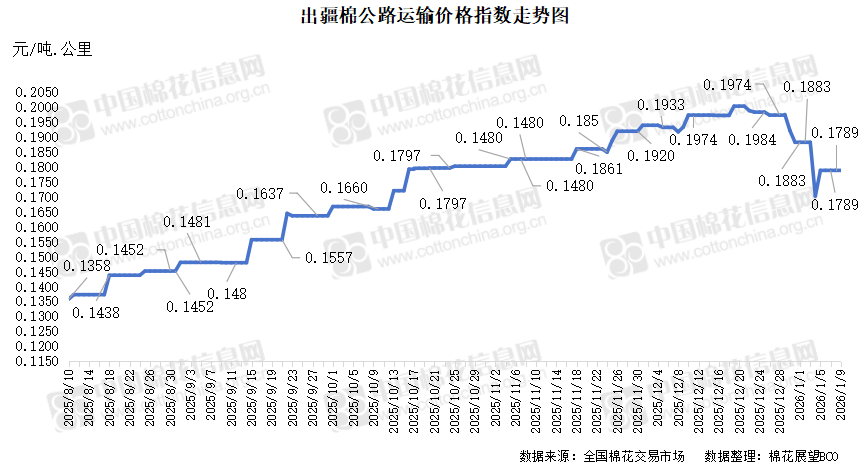 中国棉花信息网专讯 2026年1月9日,出疆棉公路运输价格指数为0.1789元/吨·公里,环比持平。今日,运输需求与运力资源同步增长,指数无变化。预计短期内,运价指数或将呈现整体相对平稳态势。