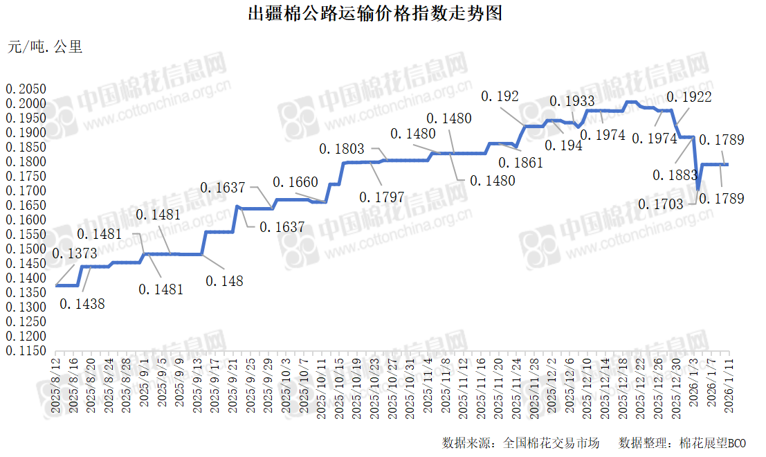 中国棉花信息网专讯 2026年1月11日,出疆棉公路运输价格指数为0.1789元/吨·公里,环比持平。今日,运输需求与运力资源同步减少,指数无变化。预计短期内,运价指数或将呈现整体相对平稳态势。