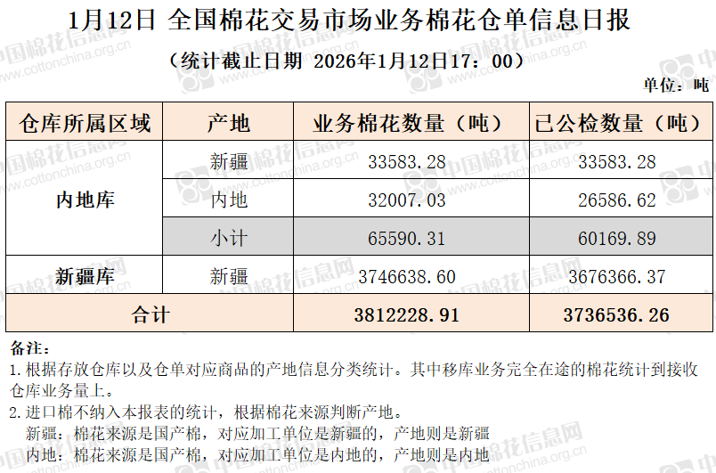 【仓单日报】CNCE业务棉花信息(1.12)