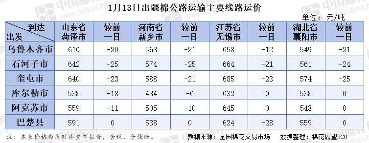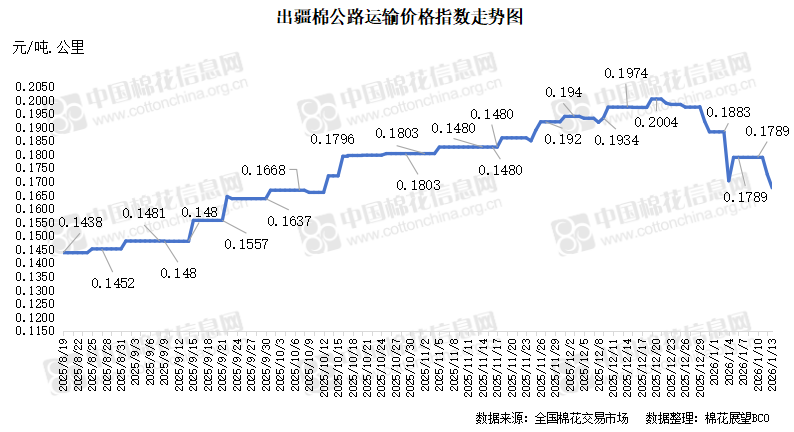 中国棉花信息网专讯 2026年1月13日,出疆棉公路运输价格指数为0.1677元/吨·公里,环比下跌2.84%。今日,运输需求低位减少,运力资源相对充足,指数小幅下降。预计短期内,运价指数或将呈现整体窄幅波动下行态势。
