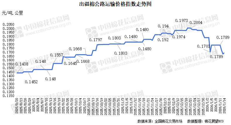 中国棉花信息网专讯 2026年1月14日,出疆棉公路运输价格指数为0.1691元/吨·公里,环比上涨0.83%。今日,运输需求明显增加,运力资源局部不足,指数小幅上涨。预计短期内,运价指数或将呈现整体窄幅震荡态势。