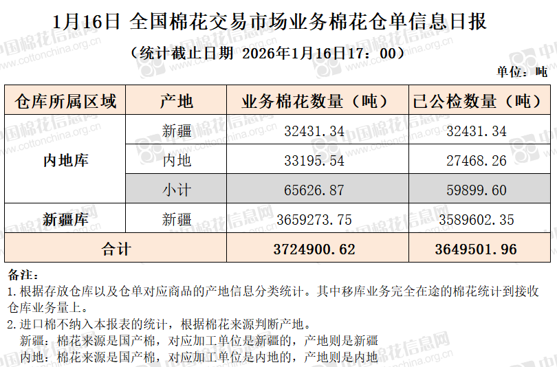 【仓单日报】CNCE业务棉花信息(1.16)