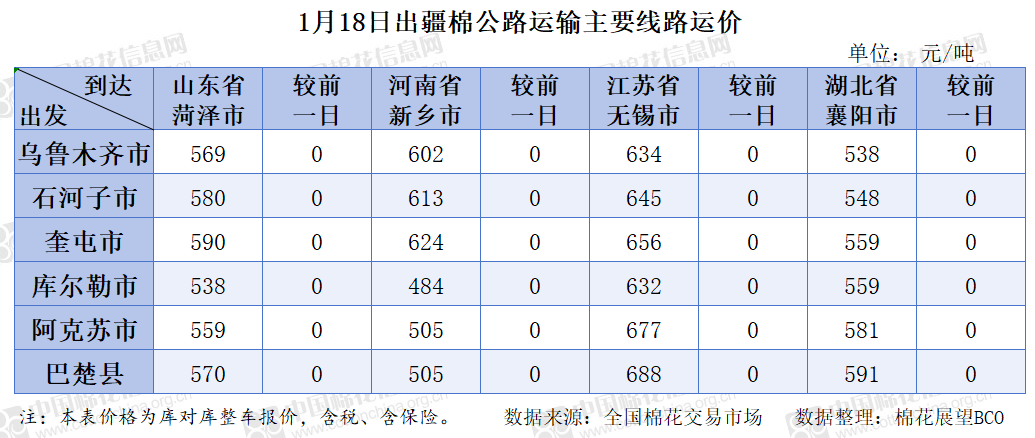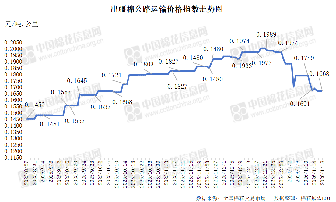 中国棉花信息网专讯 2026年1月18日,出疆棉公路运输价格指数为0.1668元/吨·公里,环比持平。今日,运输需求与运力资源同步减少,指数无变化。预计短期内,运价指数或将呈现整体相对平稳态势。