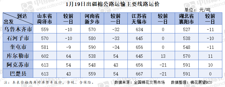 中国棉花信息网专讯 2026年1月19日,出疆棉公路运输价格指数为0.1679元/吨·公里,环比上涨0.66%。今日,运输需求增加,运力资源局部不足,指数小幅上涨。预计短期内,运价指数或将呈现整体窄幅震荡态势。