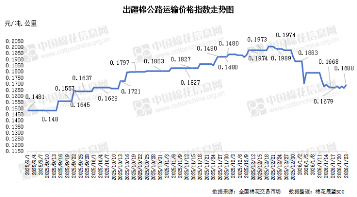 中国棉花信息网专讯 2026年1月23日,出疆棉公路运输价格指数为0.1688元/吨·公里,环比上涨1.38%。今日,运输需求总体平稳,运力资源相对不足,指数小幅上涨。预计短期内,运价指数或将呈现整体上行态势。