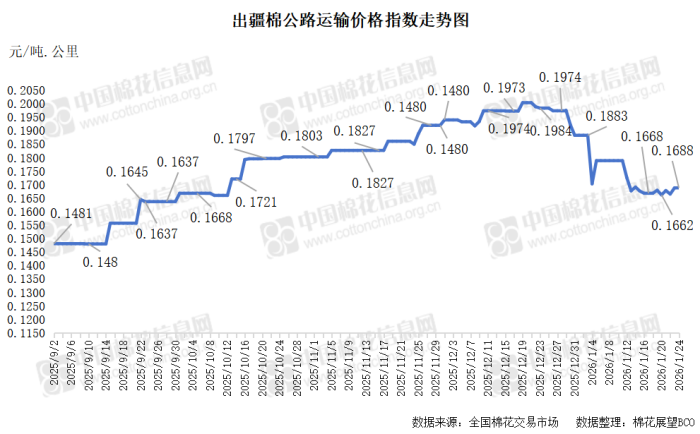中国棉花信息网专讯 2026年1月24日,出疆棉公路运输价格指数为0.1688元/吨·公里,环比持平。今日,运输需求和运力资源同步减少,指数无变化。预计短期内,运价指数或将呈现整体相对平稳态势。