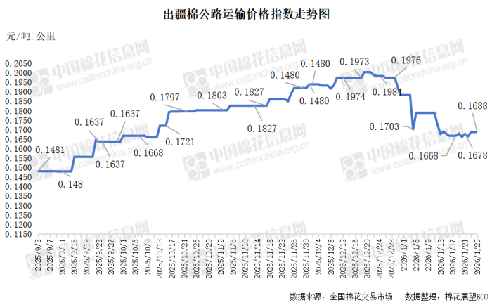 中国棉花信息网专讯 2026年1月25日,出疆棉公路运输价格指数为0.1688元/吨·公里,环比持平。今日,运输需求和运力资源同步增加,指数无变化。预计短期内,运价指数或将呈现整体相对平稳态势。