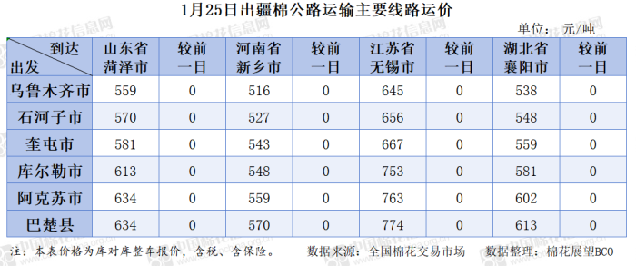 出疆棉公路运输价格指数 (2026.01.25)