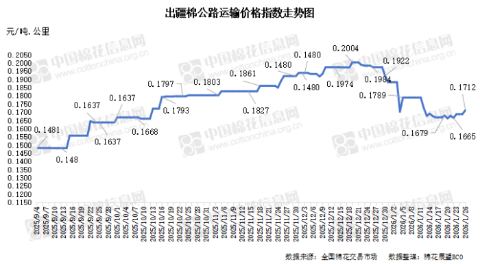 中国棉花信息网专讯 2026年1月26日,出疆棉公路运输价格指数为0.1712元/吨·公里,环比上涨1.42%。今日,运输需求增加,运力资源相对平稳,指数小幅上涨。预计短期内,运价指数或将呈现整体上行态势。
