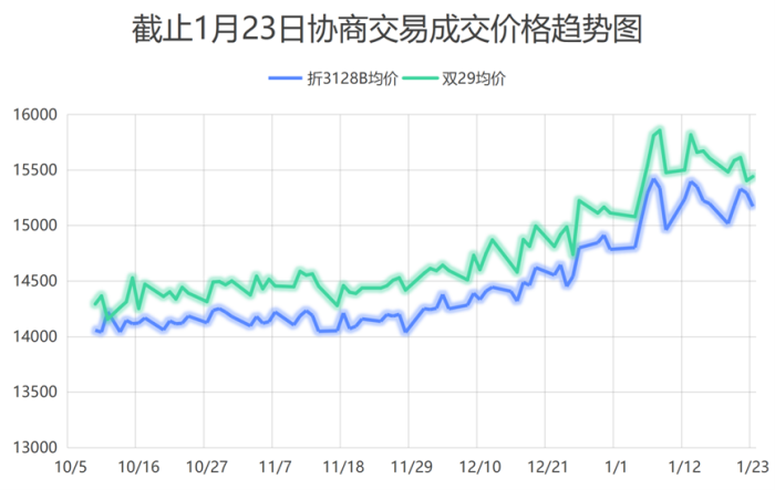 中国棉花信息网专讯 1月23日,全国棉花交易市场协商交易总成交量为12329吨。其中一口价成交7268吨,基差后点价成5061吨。一口价成交量占总成交量的58.95%。一口价资源成交均价为15445元/吨,折3128均价为15173元/吨,较上一交易日的15294元/吨下跌121/吨。其中双29批次成交均价为15442元/吨,较上一交易日的15405元/吨上涨37元/吨。