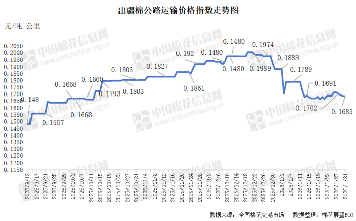 中国棉花信息网专讯 2026年1月31日,出疆棉公路运输价格指数为0.1685元/吨·公里,环比持平。今日,运输需求和运力资源同步减少,指数无变化。预计短期内,运价指数或将呈现整体相对平稳态势。