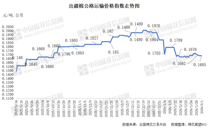 中国棉花信息网专讯 2026年2月1日,出疆棉公路运输价格指数为0.1685元/吨·公里,环比持平。今日,运输需求和运力资源同步增加,指数无变化。预计短期内,运价指数或将呈现整体相对平稳态势。