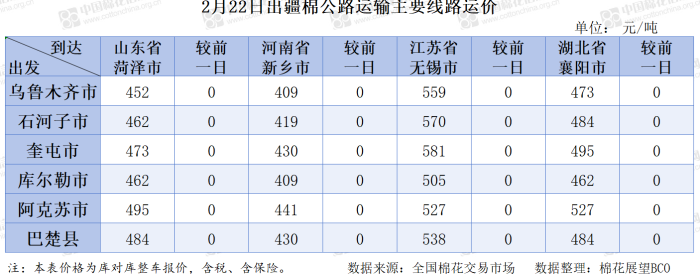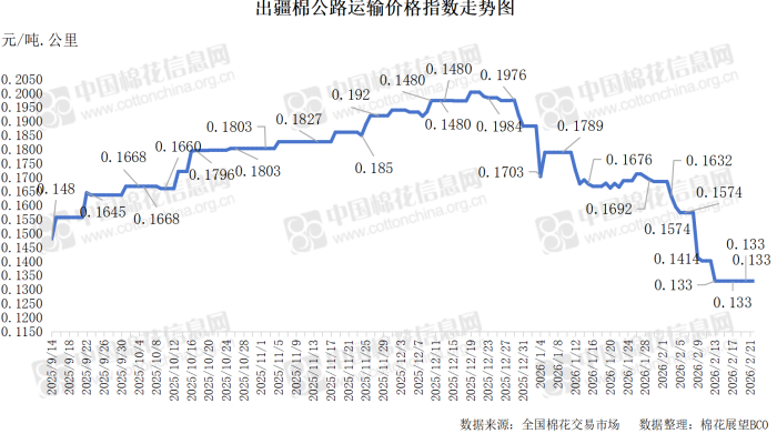 中国棉花信息网专讯 2026年2月22日,出疆棉公路运输价格指数为0.1330元/吨·公里,环比持平。今日,运输需求和运力资源同步回升,指数无变化。预计短期内,运价指数或将呈现整体低位平稳态势。