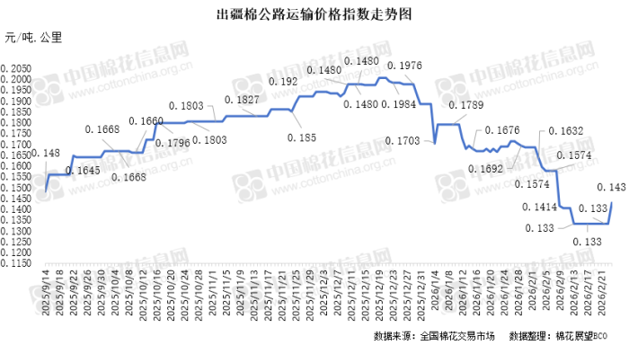 中国棉花信息网专讯 2026年2月24日,出疆棉公路运输价格指数为0.1430元/吨·公里,环比上涨7.52%。今日,运输需求上升,春节后司机陆续返岗,运力仍显紧张,带动运价指数显著上行。预计短期内,运价指数将整体呈现恢复性波动趋势。