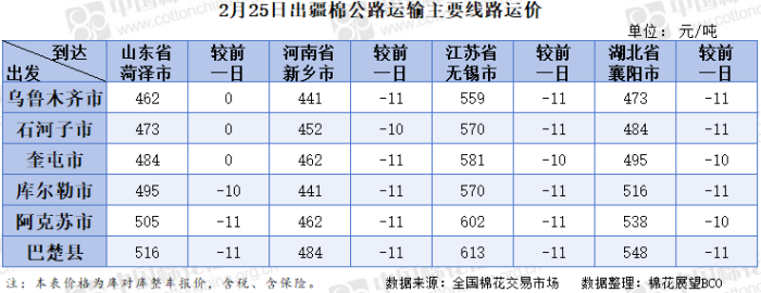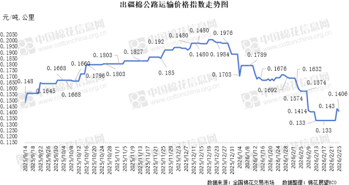 中国棉花信息网专讯 2026年2月25日,出疆棉公路运输价格指数为0.1406元/吨·公里,环比下跌1.68%。今日,运输需求低位运行,运力资源相对充足,指数小幅下降。预计短期内,运价指数将呈现整体窄幅波动趋势。