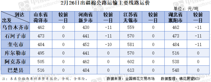 出疆棉公路运输价格指数(2026.02.26)