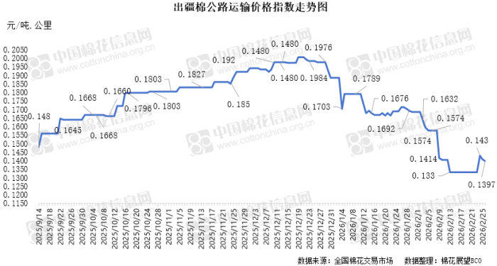 中国棉花信息网专讯 2026年2月26日,出疆棉公路运输价格指数为0.1397元/吨·公里,环比下跌0.64%。今日,运输需求低位缓增,运力资源相对充足,指数小幅下降。预计短期内,运价指数将呈现整体窄幅波动趋势。