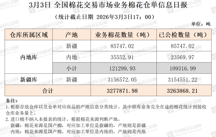 【仓单日报】CNCE业务棉花信息(3.3)
