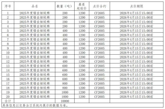 3月5日竞买交易为基差竞价模式,2025年度标准级商品棉基差起拍价为1200元/吨,点价期货合约CF2605,最晚点价期限为2026年4月15日15:00前。