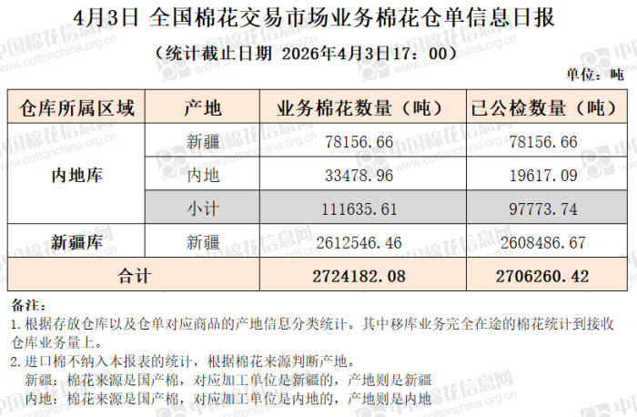 【仓单日报】CNCE业务棉花信息(4.3)